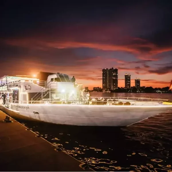 As a grand finale, enjoy the Chao Phraya Dinner Cruise, where you’ll dine aboard a luxury boat while floating past Bangkok’s lit-up skyline, temples, and riverside life — complete with live entertainment and a buffet dinner.